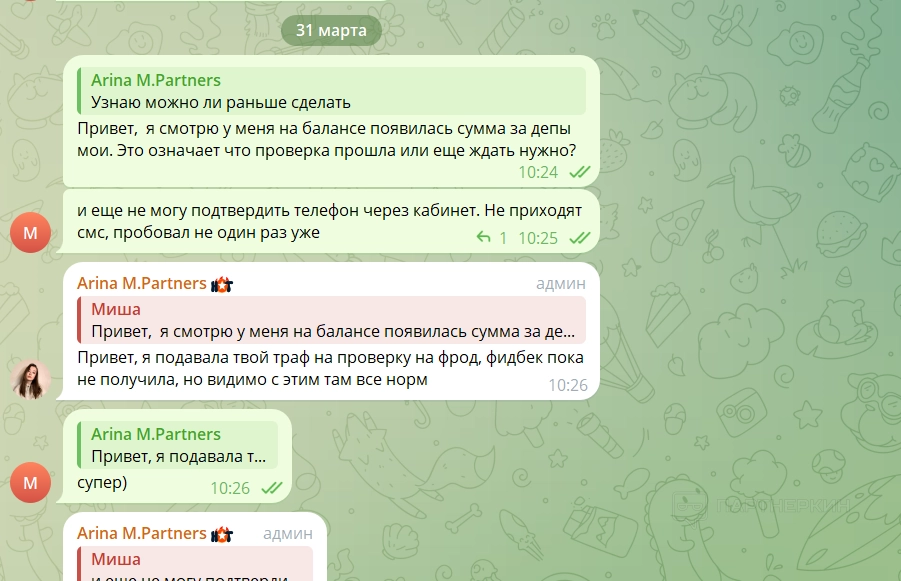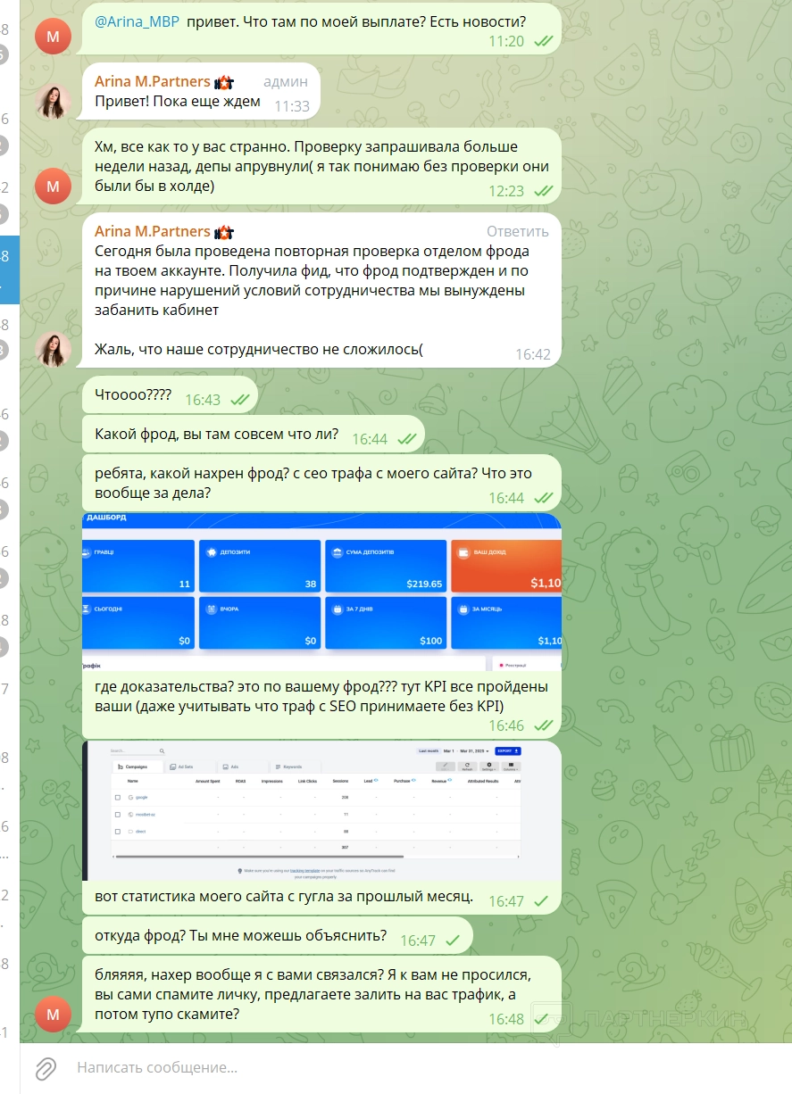 Всем привет. В общем сказать что я охренел, это ничего не сказать. Кинули меня на выплату в 1100$, типа фрод трафик. Теперь по порядку: во первых сами спамили личку в ТГ мол давай лей на нас. Я к ним не просился, я работаю достаточно времени с другой ПП по гембле. Решил попробовать. После того, как обговорили нюансы залива, решил остановиться на SEO трафе на АЗ. У них условие, что есть тестовый период и нужно в первые 14 дней отлить минимум 10 депов, если не успеваю, дадут еще +14 дней, Т.е. за 28 дней я должен дать им 10+депов для оценки трафика. 28 марта долетел десятый деп ну и дальше пошло все интересное. Сначала менеджер говорит, нужно подождать до 4 апреля (это 28 дней спустя первого депа), потом что будет проверка на фрод. Мы договорились, что проверку на фрод трафа запустят раньше срока, что бы к 4 апреля можно было получить выплату первую. Через день, как запросили проверку на фрод, у меня в аккаунте все мои депы перешли из холда в апрув. Думаю ну все, значит проверку прошли, осталось ждать 4-го апреля. 4 апреля (в пятницу) их отдел провел аналитику, решили работать далее, но тут мне менеджер пишет, что придет в понедельник проверка на фрод, сразу оплатим. Я думаю странно, но ладно. И вот 7 апреля, мне менеджер пишет «Сегодня была проведена повторная проверка отделом фрода на твоем аккаунте. Получила фид, что фрод подтвержден и по причине нарушений условий сотрудничества мы вынуждены забанить кабинет». Как вам такое? Все пруфы, скриншоты статистики и переписки прикрепляю. Я не знаю, может мне так повезло или у них такая метода сейчас работы, привлекать веб мастеров на один раз. Максимум срубить и кинуть. И еще: менеджер не стеснялся еще просить трафика на время проверки (я специально стопнул траф к ним) пока идет время проверок, спрашивать когда мы можем ждать объемы, давай заливай и так далее. Т.е максимально думают за свою прибыль. На других им просто все равно.