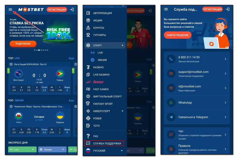 В приложении БК «Мостбет» вкладка для обращения к техподдержке букмекерской конторы скрыта в выдвижном меню: