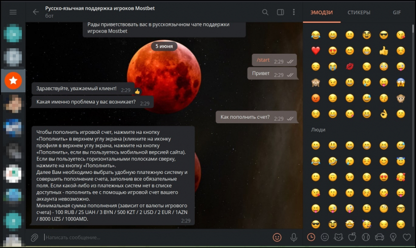 Администрация букмекерской конторы «Мостбет» активно ведут странички в социальных сетях и предоставляют консультации через мессенджеры. Один из альтернативных способов общения с саппортом – чат в Telegram (t.me/mostbetsupport_bot).