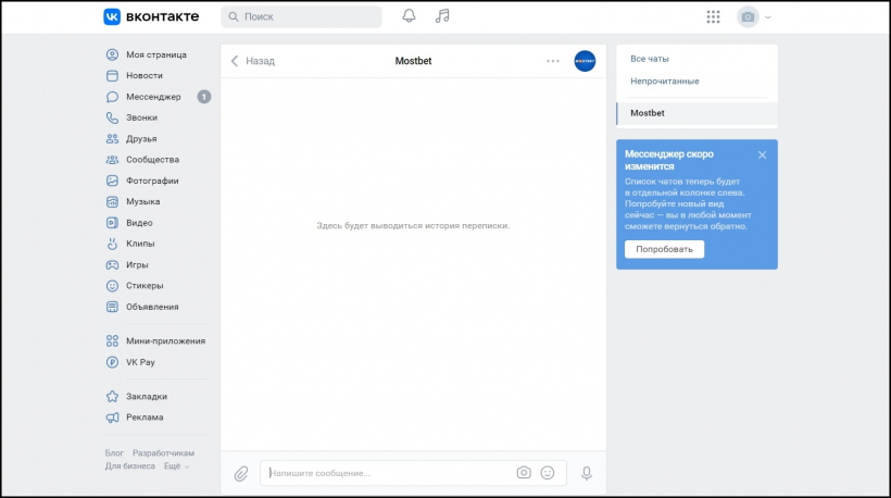 Еще один способ обращения к букмекеру – Вконтакте. БК «Mostbet» — одна из немногих компаний, которая использует страничку ВК в качестве мессенджера (vk.com/im?sel=-183167372).